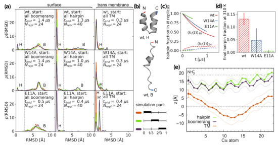 Given the adopted tREMD protocol and relatively small size of the peptides under study, we aimed to determine equilibrium populations of surface conformations in each case. Unfortunately, despite the long accumulated sampling time (85, 73, and 28 s for wt, W14A, and E11A, respectively), the RMSD distributions were still far from equilibria, indicating rather slow conformational dynamics on membrane surface. To estimate the final proportion of closed and open configurations, we assumed that the transition between them is a two-state process and considered a set of temperature-dependent kinetic equations operating on stochastic tREMD trajectories (Figure 1c) [41]. The extrapolation of fitted solutions to infinite time for tREMD simulations starting from all hairpin, and, likewise, all boomerang structures should, in principle, lead to the same equilibrium hairpin population at K. Accordingly, we estimated this population as an average from both kinds of tREMD runs and obtained , , and hairpin fractions for wt HAfp, W14A, and E11A mutants, respectively, at K (Figure 1d). In qualitative agreement with experimental data, this result indicates greater preference towards hairpin structure for wt HAfp compared to W14A mutant [11,14]. We did not find direct experimental evidence for the nature of the dominant E11A conformation, but, based on its reported thermodynamic binding signature with moderately unfavorable entropy component similar to W14A and rather different from highly entropy penalized wt HAfp [14], the dominance of less constrained boomerang structure is likely also in its case.