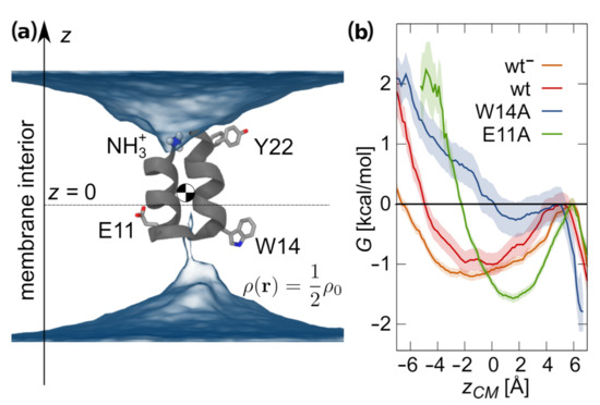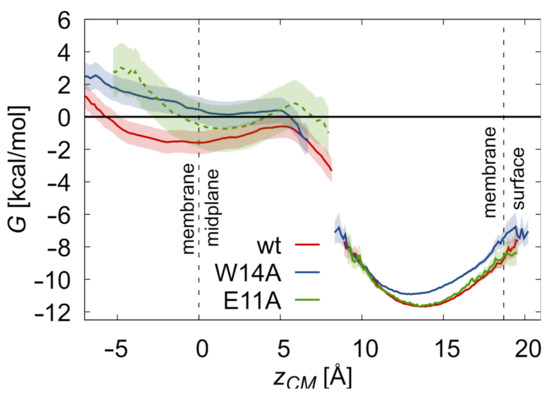 Free energy of unrestrained peptides as a function of PCOM position along the z axis, , defined as above was evaluated based on the probability distributions of gathered during unrestrained tREMD simulations, according to relation where is an arbitrary constant. In the case of transmembrane configurations, an additional biasing potential was introduced: for and 0 otherwise, that prevented peptide from surfacing, with Å for wt and E11A and Å for W14A peptides. The resulting biased probability distribution, , was subsequently reweighted to obtain the unbiased , according to the following formula: , with c being a normalization constant [44].