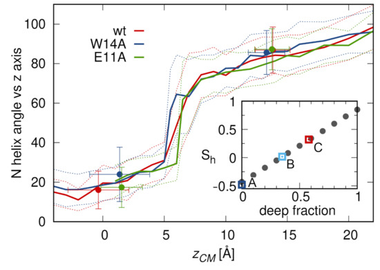 N-helix angle with respect to membrane normal in degrees as a function of insertion depth. Lines represent data from umbrella sampling simulations for restrained hairpin conformations, while points are data from unrestrained simulations. Error bars correspond to one standard deviation. Inset: The estimated N-helix order parameter as a function of deep configurations fraction. Squares are the experimental data for : (A) W14A [14]; (B) wt HAfp20 [53]; and (C) wt HAfp23 [17,18,52].