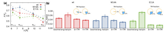 The results unanimously suggest a greater tendency to penetrate membrane interior for the wt HAfp and E11A mutant compared to the W14A mutant. While there is certainly no quantitive match between population fractions assessed from the PMF calculations and the estimates based on TRP fluorescence quenching or ATR-FTIR spectroscopy discussed above, we note that the simulation model most likely overestimates the free energy difference between surface and deep minima due to limited system size that enhances the compactness of the considered membrane slab, but it still captures qualitative differences between the considered peptide variants.