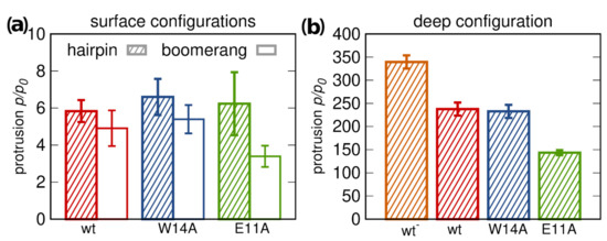 The extent of peptide-promoted lipid tail protrusions [30] has often been invoked as a predictor of their ability to induce lipid mixing between membranes, as a proxy for fusogenic activity [23]. According to our simulations, the presence of surface bound peptides indeed increases the likelihood of lipid tail protrusions, but only roughly sixfold compared to pure POPC membrane (Figure 6a). Aside from being relatively weak and showing little dependence on peptide conformations, the effect observed for surface configurations is equally strong for fusion active wt HAfp and inactive W14A mutant, and, hence, does not explain the loss of function in this latter case.