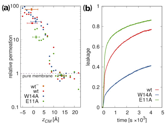 According to simulations, peptides located at the membrane surface do not lead to any increase in its water permeability compared to pure POPC membrane (Figure 7a). However, a sharp onset of permeability is observed upon transition to deep minimum. This effect is somewhat less pronounced for the E11A mutant, possibly due to its greater hydrophobicity and smaller insertion depth. The highest permeation was observed for the most deeply inserted wt variant. The simulated results are in fair agreement with the experimental leakage assays (Figure 7b). Apparently lower leakage caused by W14A mutant as compared to other peptides may be explained by its less stable deep configuration (Figure 3). Notably, however, relative magnitudes of leakage for the wt HAfp and E11A mutant observed in experiments are opposite to those suggested by simulations. In agreement with the interpretation of fluorescence quenching experiment (Figure 5b), this may indicate that the fraction of deeply inserted E11A configurations may be actually somewhat greater than in the case of wt. Taken together with greater stability but shallower depth of E11A transmembrane free energy minimum (Figure 2b), this would imply that comparably greater fusogenic activity of the wt is predominantly the effect of its ability to localize deeper within the membrane core. To check whether the difference between W14A and wt/E11A peptides was not driven by a diminished surface concentration resulting from an order of magnitude lower partition coefficient for W14A (∼1.6 kcal/mol difference in Gibbs binding free energy, Table 1), we also performed the experiment at lower (1:500) peptide/lipid ratio. All three leakage curves looked more similar to each other; however, wt and E11A peptide still led to more efficient permeation (Figure S10).