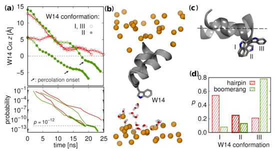 Of four independent supervised insertion procedures initiated from diverse starting configurations two turned out to be successful in peptide reaching the deep free energy well within 10 simulation rounds (Figure 8a, Top). In each such case, prior to achieving membrane-spanning configuration, the peptide induced the formation of a thin water wire between W14 side chain and aqueous compartment on the opposite membrane side (Figure 8b). The apparent role in this process was played by W14 indole nitrogen atom. It was effective, however, only in one of three possible side chain conformers that provided cross-membrane facing nitrogen orientation (Figure 8c), and without assuming this conformer peptide progression was stalled. Intriguingly, this conformer appears more frequently among closed rather than open surface configurations (Figure 8d), thus contributing further to hairpin insertion readiness, in addition to its already more favorable shape. To test an alternative hypothesis of N-terminus driven insertion, we also carried out simulations based on supervised terminal amino group nitrogen atom position, but none of the four trials for hairpin structure was successful (Figure S6).