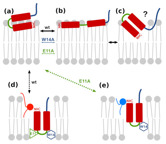 Possible insertion modes of HAfp into lipid membrane: (a,b) surface hairpin and boomerang, respectively; (c) obliquely inserted hairpin; (d) deeply inserted transmembrane hairpin (wt); and (e) shallowly inserted transmembrane hairpin (E11A).