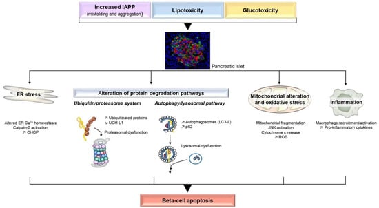 In rodents, IAPP is nonamyloidogenic due to proline substitutions in the amyloidogenic sequence, and these species do not spontaneously develop diabetes [33]. However, overexpression of human IAPP (h-IAPP) in rodent models promotes amyloid deposits, beta-cell dysfunction and apoptosis, consequently leading to reduced beta-cell mass and hyperglycemia [22,33,34], supporting the role of h-IAPP as a contributor to the islet pathology in human T2D. The following paragraphs will focus on the molecular pathways by which amyloidogenic IAPP promotes beta-cell apoptosis.