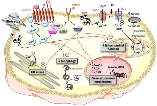 Main molecular mechanisms induced by glucagon-like peptide-1 (GLP-1) to protect beta-cells from apoptosis. Beta-cell stressors (such as increased IAPP, gluco- and/or lipotoxicity) may trigger ER stress, alter mitochondrial function and/or the autophagic flux and modify gene expression. GLP-1 and GLP-1RA have been reported to protect beta-cells by alleviating these deleterious effects.