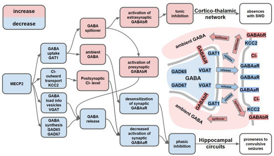Besides the inhibitory transmission by itself, a preponderance of seizures in RTT is affected by a plethora of factors modulating the inner excitatory state of inhibitory circuitry. For example, seizure predisposition may be provoked by a selective loss of MECP2 in cholinergic neurons via decreased expression of excitatory cholinergic receptors (α7 nAChR) in parvalbumin-positive inhibitory neurons [135]. Thus, the genesis of seizures in RTT can be attributed to a multilevel disruption of neuronal circuits consequential to the dysfunction in several different molecular pathways with the major role of inhibitory signaling, particularly the balance between tonic and phasic inhibition.