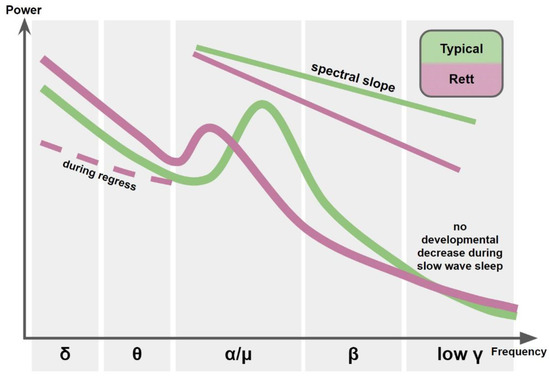Quantitative studies of spontaneous EEG recorded under eyes-open or eyes-closed conditions show the attenuation of alpha and beta band power with concomitant generalized increase of theta and delta activity in RTT [137,139,142,143]. Moreover, abnormally increased delta activity in girls with RTT was reported also during slow wave sleep (SWS), suggesting that predominance of low-frequency activity might characterize EEG in RTT regardless of the functional state [141].