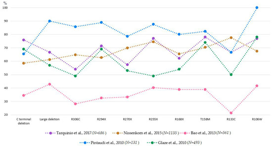 Recent studies suggested that some MECP2 mutations might be associated with slightly different manifestations of RTT clinical symptoms [184,185,186,187,188] nonsense mutations in the beginning of the gene (such as R168X, R255X and R270X) and large deletions within MECP2 associated with more severe RTT phenotype [189,190,191,192]. The relationship between MECP2 mutation and seizure phenotype has been investigated in several studies with the largest studies of the last decade summarized in Figure 3 [43,44,51,53,192,193]. Noteworthy, unlike general large difference in the reported prevalence of seizures (e.g., close to 90% in the study of Pintaudi [44] and colleagues and less than 40% in the study of Bao and colleagues [53], the profile of changes between genotypes seems to be rather consistent. For example, seizures were more frequently observed in patients with T158M and less frequently in those with R306C mutations across these studies. As Cuddapah and colleagues did not report the percentage of individuals affected with seizures in each genotype group, but characterized the between genotype difference by average scores [192], we did not present their results in the figure. Nonetheless, these authors’ findings are compatible with previous reports as they found that seizures were less frequent in R306C cases as compared to R255X and R294X in a sample of 815 patients with typical RTT [192]. At the same type, there are discrepancies between studies. Patients with the R106W mutation were associated with higher risk for seizures in all but one study ([193]; notably, this was the largest n = 1135), and patients with R255X mutations in all but the study of Glaze and colleagues [51]. The reason for this inconsistency needs to be further identified. Probably, these genotypes are particularly sensitive to the methods of seizure assessment. Noteworthy, more clinically severe genotype (e.g., R270X) did not always correspond to phenotypes with higher prevalence of epilepsy, supporting the idea about the non-causative role of epilepsy in RTT development.