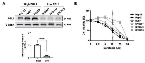 FGL1 expression level and viability in HepG2, Huh7, Hep3B, SNU387, SNU449, and SNU475 hepatocellular carcinoma (HCC) cell lines. (A) Expression of FGL1 in the six HCC cell lines, as determined through immunoblotting. Data are presented as the mean ± standard deviation (SD) (n = 3). *** p < 0.001, significantly different from HCC cells with high FGL1-expressing. (B) Cell viability in the six HCC cell lines after sorafenib treatment. Data are presented as the mean ± standard deviation (n = 6).