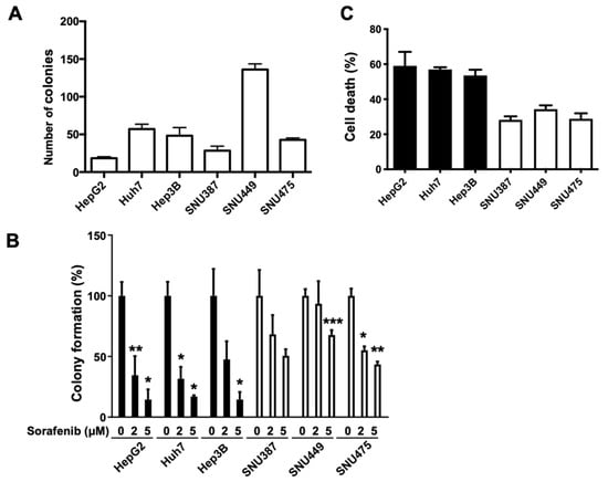 Effect of sorafenib on the cell colony forming capacity and cell death of HepG2, Huh7, Hep3B, SNU387, SNU449, and SNU475 hepatocellular carcinoma (HCC) cell lines. (A) Number of colonies after seeding 200 cells of each HCC cell line in the plate. (B) Effect of sorafenib on the colony forming potential of HCC cells. The six HCC cell lines were incubated for 7 days in the presence of 0, 2, or 5 µM sorafenib. Data are presented as the mean ± standard deviation (SD) (n = 3). * p < 0.05, ** p < 0.01, and *** p < 0.001, significantly different from 0 µM sorafenib-treated cells. (C): Effect of sorafenib on cell death measured by flow cytometry using Annexin V-FITC and propidium iodide (PI) staining. The graph presents mean ± SD values of three independent experiments.