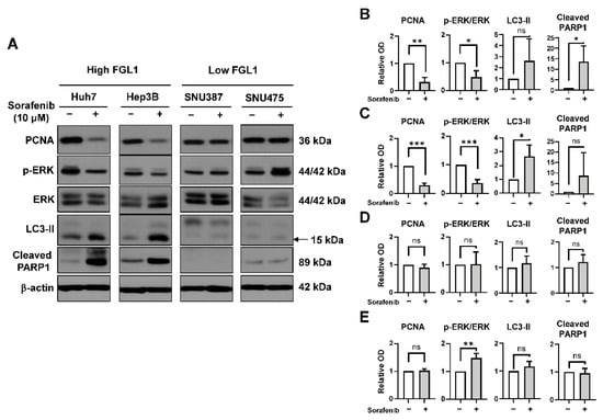 To examine whether the potential mechanism underlying the therapeutic action of sorafenib differed depending on the basal level of FGL1 in HCC cell lines, we measured the levels of proteins related to cell proliferation, autophagy, and apoptosis by western blotting (Figure 3A). Sorafenib treatment in Huh7 and Hep3B cells lowered the levels of PCNA and phosphorylated ERK while increasing those of LC3-II and cleaved PARP1 (Figure 3B,C). However, in SNU387 and SNU475 cells, sorafenib affected neither PCNA and phosphorylated ERK nor LC3-II, and cleaved PARP1 (Figure 3D,E).