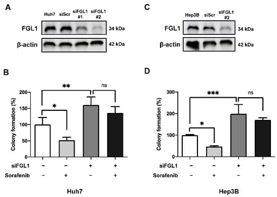 To investigate the impact of FGL1 on HCC cell lines, we knocked down endogenous FGL1 in two high FGL1-expressing HCC cell lines, Huh7 and Hep3B, using siRNA. FGL1 levels were decreased in both cell lines after siFGL1 transfection (Figure 4A,C). Knockdown of FGL1 increased the colony formation ability of Huh7 and Hep3B cells by 61% (p = 0.0013) and 99% (p = 0.0002), respectively (Figure 4B,D). The anticancer effect of sorafenib was notably interrupted by siFGL1 in Huh7 (−24%) and Hep3B (−28%) cells, in contrast to the anticancer effect of sorafenib mediated by scrambled siRNA in Hur7 (−48%) and Hep3B (−52%) (Figure 4B,D).