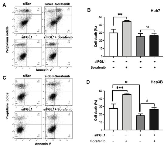 To further investigate the effect of siFGL1 on resistance to sorafenib, cell death was examined by flow cytometry of siFGL1- and/or sorafenib-treated HCC cells (Figure 5A,C). Flow cytometric analysis revealed that sorafenib treatment significantly increased the cell death rate for both Huh7 and Hep3B cells (Figure 5). However, knockdown of FGL1 impeded sorafenib-induced cell death for both Huh7 and Hep3B cells (Figure 5B,D), although there were slight increases in the sorafenib-induced cell death rate in Hep3B cells with siFGL1.