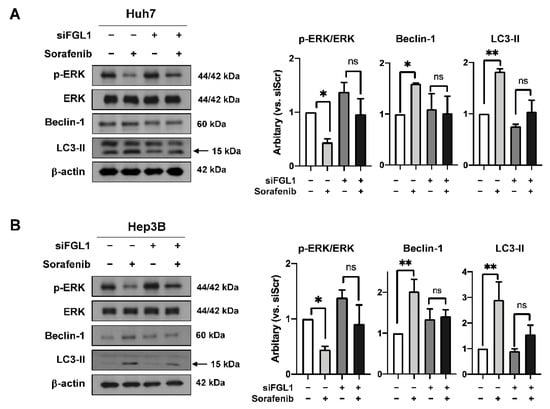Effect of FGL1 knockdown on p-ERK, ERK, Beclin-1, and LC3-II in hepatocellular carcinoma (HCC) cells following sorafenib treatment. Representative western blot and data from Huh7 (A) and Hep3B (B) cells. Data are presented as the mean ± standard deviation (n = 3). * p < 0.05 and ** p < 0.01, compared to siScr-treated cells. siFGL1 (−), treated with siScr. Sorafenib (−), treated with vehicle (DMSO).