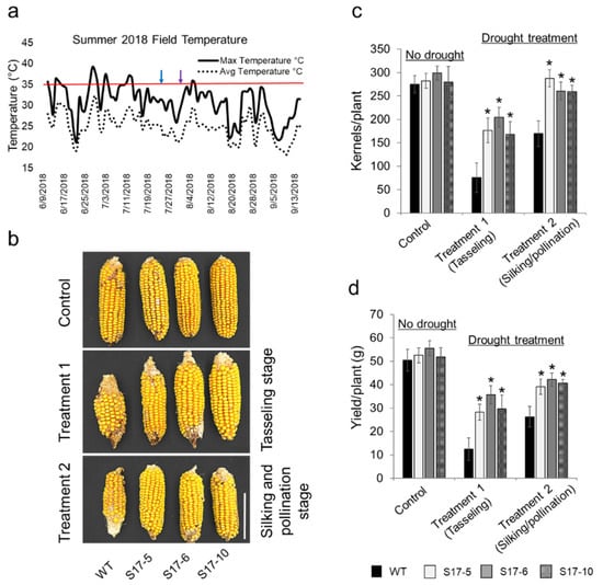 AtGRXS17-expressing maize lines (S17-5, S17-6, and S17-10) along with wild-type (WT) B104 plants were grown in the field. Drought stress was imposed at VT (tassel) and R1 (silking) stages by withholding watering, and the yields were compared. During the period of drought stress, the average maximum daily temperature and average daily temperature were 30.4 °C and 23.5 °C, respectively (Figure 1a). Drought stress had less impact on the kernel number set in each ear of AtGRXS17-expressing lines compared to the WT plants at both VT and R1 stages (Figure 1b). Kernel numbers under drought treatments at the VT stage were 76, 176, 204, and 168 for WT, S17-5, S17-6, and S17-10, respectively. Similarly, kernel numbers under the drought treatments at the R1 stage were 170, 288, 260, and 259 for WT, S17-5, S17-6, and S17-10, respectively (Figure 1c). In WT and transgenic maize, the weight of seeds per thousand was not different in control and drought during the R1 stage. However, when drought stress was imposed at the VT stage, AtGRXS17-10 had significantly higher seed weight compared to the WT and other AtGRXS17-expressing lines (Supplementary Figure S1b). On average, AtGRXS17-expressing lines showed at least 127% and 48% more yield than WT plants when drought stress was imposed at VT and R1 stage in the field, respectively (Figure 1d). No significant difference in the yield was found between AtGRXS17-expressing lines and WT plants under well-watered conditions (Figure 1b–d). Similar results were observed in the greenhouse experiments. All the AtGRXS17-expressing lines had a higher yield than WT plants when drought stress was imposed at VT stage in the greenhouse (Supplementary Figure S2a,b). Our data also indicated that the drought stress was more severe if imposed at the VT stage when compared with the R1 stage in the field (Supplementary Figure S2c).