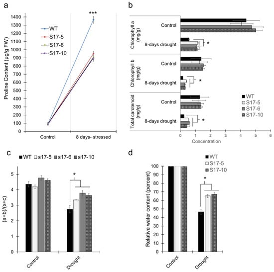 WT along with three transgenic lines were grown in the greenhouse under optimum condition. Drought stress was imposed on maize plants at VT stage for 8 days. Chlorophyll content (chlorophyll a and b) along with the carotenoid contents were measured from control and drought-stressed plants as previously explained []. Briefly, chlorophyll contents along with carotenoids were extracted from 0.2 g of leaf samples using 100% acetone. The extract was centrifuged for 5 min at 500× g. Chlorophyll and carotenoid contents were determined by measuring the absorbance at 662 nm, 645 nm and 470 nm. The following equations were used to determine the chlorophyll and carotenoid contents.