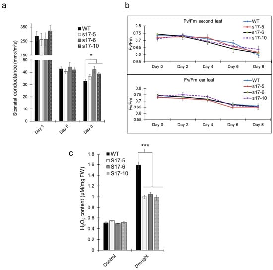 Stomatal conductance of both AtGRXS17-expressing and WT plants gradually decreased as drought stress was imposed. Stomatal conductance remained similar for both the transgenic and WT lines on day 1 and day 5 of drought treatments but decreased in WT plants on day 8, while remaining steady in AtGRXS17-expressing plants (Figure 4a). Chlorophyll fluorescence, as measured by Fv/Fm ratio, gradually decreased under drought treatment. No difference in the chlorophyll fluorescence was observed on ear leaf and second leaf from top in both WT and AtGRXS17-expressing lines over the drought period (Figure 4b). H2O2 content was similar in both WT and AtGRXS17-expressing maize plants when grown in well-watered conditions. H2O2 significantly accumulated in WT plants when compared with AtGRXS17-expressing maize plants under drought conditions (Figure 4c).