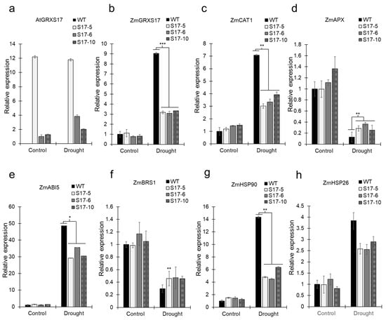 Drought treatments induced changes in expression of drought-stress related genes (Figure 5a–h). Though yield difference among the transgenic lines was not observed, S17-5 displayed the highest expression of the transgene AtGRXS17, followed by S17-6, and S17-10 (Figure 5a). ZmGRXS17, an endogenous GRXS17 of maize, had an increase in the expression in WT plants in comparison to the AtGRXS17-expressing maize lines under drought conditions (Figure 5b). Similarly, antioxidation enzymes showed varied effect of drought stress on their expression. Under drought, catalase (ZmCAT1) expression increased in WT plants whereas L-ascorbaste peroxidase (ZmAPX) expression was lower in WT plants when compared to AtGRXS17-expressing maize lines (Figure 5c,d). ZmABI5, ABSCISIC ACID-INSENSITIVE 5, expression was higher in the WT plants than AtGRXS17-expressing maize lines after drought treatment (Figure 5e). Brassinosteroid synthesis 1 (ZmBRS1) expression decreased under drought conditions, less in WT plants than AtGRXS17-expressing lines (Figure 5f). Heat shock proteins (HSPs) experienced higher expression of both ZmHSPs (ZmHSP90 and ZmHSP26) in WT plants than AtGRXS17-expressing maize lines after drought treatment (Figure 5g,h).