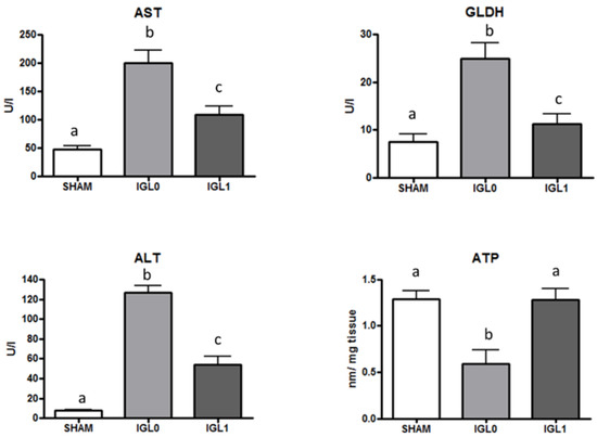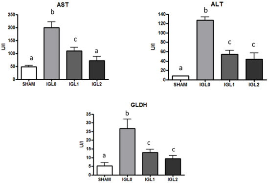 AST, ALT, and GLDH levels in steatotic liver samples for SHAM, IGL-0, IGL-1, and IGL-2 groups. Results are expressed as mean ± SEM (n = 6). Different lowercase letters indicate significant differences among treatments p < 0.05.