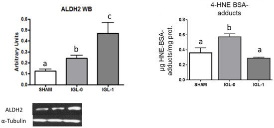 We correlated mitochondrial aldehyde dehydrogenase 2 (ALDH2) with the toxic aldehydes (4-HNE) and oxidized protein (AOPP) levels. Figure 5 shows an increase in the expression of the ALDH2 enzyme, which is concomitant with a decrease in the 4-HNE protein adducts formation, notably decreasing the levels of oxidized proteins going from IGL-0 to IGL-1 and IGL-2. When comparing IGL-0 and IGL-1, which only differ in the presence or absence of PEG, it can be seen that ALDH2 is augmented, the 4-HNE protein adducted, and AOPP decreased solely by the effect of PEG.