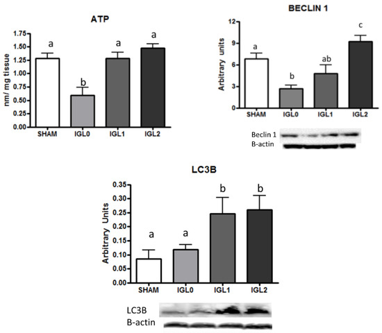 ATP, Beclin-1, and LC3B in steatotic liver samples for SHAM, IGL-0, IGL-1, and IGL-2 groups. Results are expressed as mean ± SEM (n = 6). Different lowercase letters indicate significant differences among treatments (one-way ANOVA, p < 0.05).