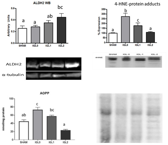 ALDH2 expression and levels of AOPP and 4HNE protein adducts in steatotic liver samples for SHAM, IGL-0, IGL-1, and IGL-2 groups. Results are expressed as mean ± SEM (n = 6). Different lowercase letters indicate significant differences among treatments (one-way ANOVA, p < 0.05).