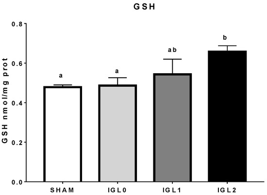 Reduced glutathione (GSH) in IGL-2 solution compared to IGL-1 and IGL-0 (no PEG35) in steatotic liver samples. Different lowercase letters indicate significant differences among treatments (one-way ANOVA, p < 0.05).