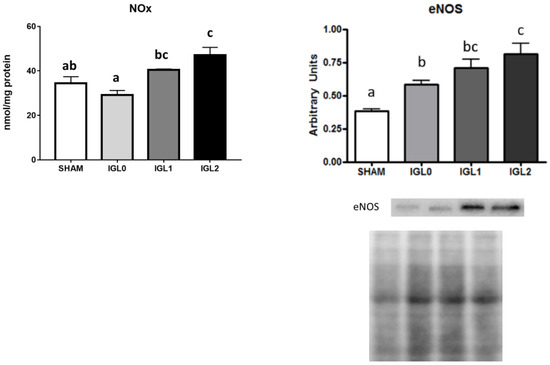 NOx and eNOS in steatotic liver samples for SHAM, IGL-0, IGL-1, and IGL-2 groups. Results are expressed as mean ± SEM (n = 6). Different lowercase letters indicate significant differences among treatments (one-way ANOVA, p < 0.05).