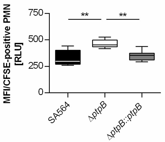 2.1. PtpB Affects the Ability of S. aureus to Evade Phagocytosis by PMNs