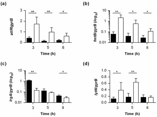 - Groicher, K.H.; Firek, B.A.; Fujimoto, D.F.; Bayles, K.W. The Staphylococcus aureus LrgAB Operon Modulates Murein Hydrolase Activity and Penicillin Tolerance. J. Bacteriol. 2000, 182, 1794–1801. [Google Scholar] [CrossRef]