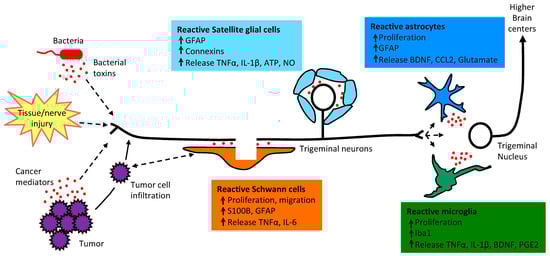 - Bartley, J. Could glial activation be a factor in migraine? Med. Hypotheses 2009, 72, 255–257. [Google Scholar] [CrossRef] [PubMed]
