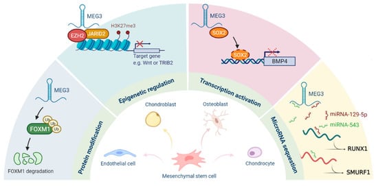 Moreover, MEG3 modulates chondrocyte differentiation by sequestering miRNAs. It has been demonstrated that the expression of MEG3 is gradually elevated when BMSCs differentiate into chondrocytes, while miR-129-5p is downregulated []. Work by Zhu et al. showed that forced expression of MEG3 elevates the expressions of various chondrocyte-related genes, and one of them is RUNX1, a target gene of miR-129-5p []. Apart from regulating the miR-129-5p/RUNX1 axis to promote chondrocyte differentiation, MEG3 also participates in endothelial differentiation. It has been shown that the expression of MEG3 is decreased during the transition from BMSCs to endothelial cells []. In a rat model of diabetic erectile dysfunction, the expression of MEG3 was found to decrease in the corpus cavernosum tissues of rats receiving intracavernous implantation of BMSCs []. MEG3 is able to interact with forkhead box protein M1 (FOXM1) and accelerate the degradation of FOXM1 via ubiquitination. The reduced expression of MEG3 leads to upregulation of FOXM1, which physically interacts with the vascular endothelial growth factor (VEGF) promoter and transcriptionally activates its expression []. Taken together, MEG3 mediates multi-lineage differentiation by serving as a cofactor or a miRNAs sponge to manage target expression.