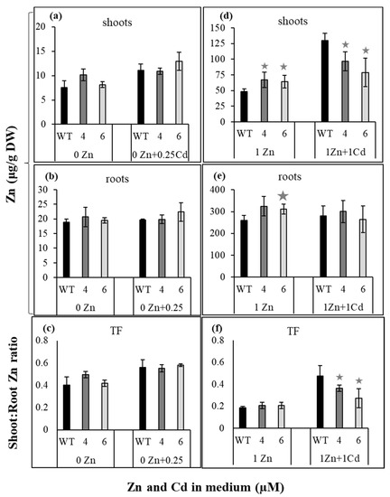 Additionally, it has been shown that the efficiency of root-to-shoot translocation of metals depends on the concentration of a given metal and on the mineral composition of the medium. For example, the dependence of Zn translocation efficiency on external Zn has been shown in A. thaliana [23] and in tobacco [24,25]. Furthermore, Zn translocation depends on the presence of other metals in the medium, including Cd. Inhibition of translocation has often been described [26,27,28]; however, our recent study showed stimulation in the presence of certain Cd concentrations [28,29]. An increase in Zn translocation was found in the presence of 0.25 and 1 μM Cd in plants grown at low/medium Zn concentrations (0 to 1 μM). To compare, for plants exposed to 5–50 μM Zn, translocation of Zn to shoots was reduced in the presence of 4 μM Cd (relative to the medium without Cd).