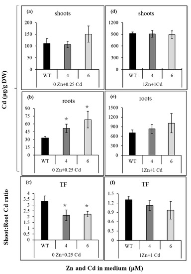 Cadmium concentration in wild-type and NtZIP4A/B-RNAi plants grown under various Zn and Cd concentrations. 3.5-week-old plants of wild-type (WT) and NtZIP4A/B-RNAi lines (number 4 and number 6) grown in the quarter-strength Knop’s medium were exposed for 17 days to the control medium supplemented with pairwise combinations of Zn (0; 1 μM) and Cd (0; 0.25; 1 μM) concentrations. Concentrations of cadmium were determined in the shoots (a,d), and roots (b,e). The Translocation Factor (TF) was determined as the ratio of shoot/root concentrations of Cd (c,f). Values correspond to means ± SD (n = 5); those significantly different from wild-type (WT) (evaluated by Student’s t-test) are indicated by asterisks