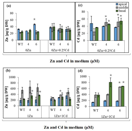 Zinc and cadmium concentration in the apical, middle, and basal parts of the roots from wild-type and NtZIP4A/B-RNAi plants, grown under various Zn and Cd concentrations. 3.5-week-old plants of wild-type (WT) and NtZIP4A/B-RNAi lines (number 4 and number 6) grown in the quarter-strength Knop’s medium were exposed for 17 days to the control medium supplemented with pairwise combinations of Zn (0; 1 μM) and Cd (0; 0.25; 1 μM) concentrations. Concentrations of metals were measured in the apical parts (2.5 cm) from the main and lateral roots; basal (proximal) parts (1/4 of the total length of the main roots); middle part (remaining parts of the main roots). The basal and the middle parts of the roots were collected from the main root only (adventitious roots were excised). Zinc concentration (a,b), cadmium concentration (c,d). Values correspond to arithmetic means ± SD (n = 3); those significantly different from wild-type (WT) (evaluated by Student’s t-test) are indicated by asterisks