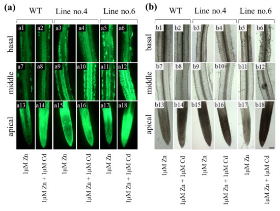 The Zn localization in the roots grown on the medium containing 1 µM Zn (with or without 1 µM Cd) was shown in Figure 4a, and sections at bright field at Figure 4b. In the apical parts of the wild-type plants exposed to 1 µM Zn, the strongest green signal was found above the quiescent center (QC) in the differentiating cortex cells (Figure 4(a13)). After adding 1 µM Cd, the intensity of green signal in the whole root apex increased (Figure 4(a14)). In the middle and basal root parts of wild-type plants Zn distribution was not significantly different between treatments (Figure 4(a7 vs. a8); Figure 4(a1 vs. a2)). Overall, a higher amount of Zn was present in the stele, lower in the cortex. Interestingly, moderately higher accumulation was detected in the cortex of the basal root segment.