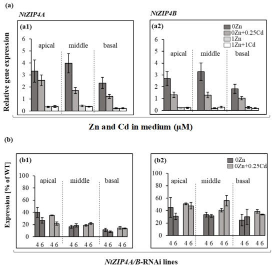 In the wild-type plants, both NtZIP4A and NtZIP4B responded similarly to applied growth conditions in the apical, middle, and basal root parts (Figure 6(a1,a2)). The highest expression was found at Zn-deficiency, and was moderately reduced in the presence of 0.25 µM Cd. Upon exposure to 1 µM Zn, the amount of transcript highly decreased (to a similar extent in the presence or absence of Cd).