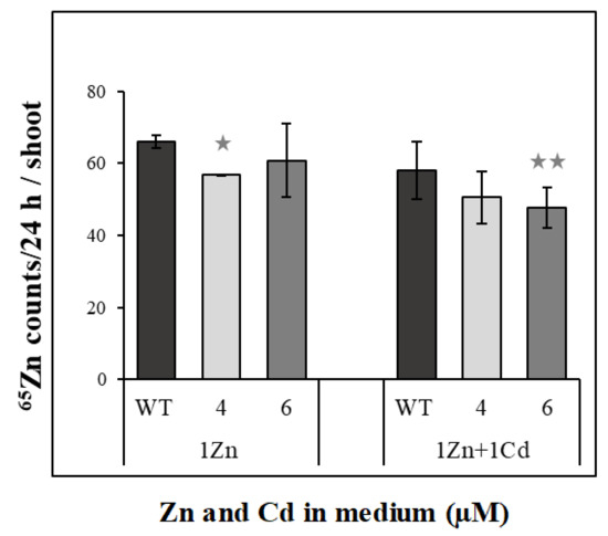 Previous experiments suggested possible contribution of NtZIP4A/B to the regulation of Zn/Cd status-dependent translocation to shoots of both metals, and the involvement of the basal root part by retaining excess metal. To learn more, here we applied 65Zn to the basal root parts of the wild-type and RNAi plants and determined the amount of radioactive Zn transferred to shoots. Suppression of NtZIP4A/B resulted in a moderate reduction of the amount of 65Zn in the shoots of RNAi plants; however, the difference was statistically significant for one line only (Figure 9).