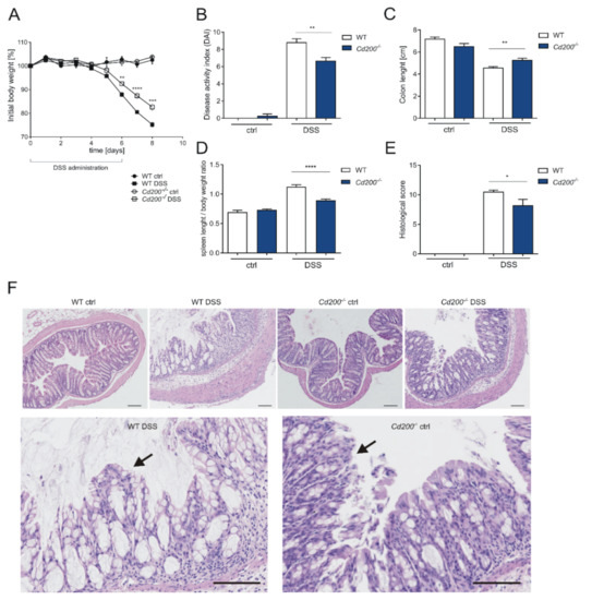 2.1. Lack of CD200 Diminishes the Severity of DSS-Induced Colitis