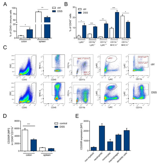 Analysis of immune cell infiltration in colon and spleen during DSS-induced inflammation. (A) Frequency of immune cells (CD45+) in colon and spleen in DSS-treated and control mice, n = 4–7; (B) Percentage of neutrophils (Ly6G+), monocytes (CD11b+Ly6C+ and CD11b+Ly6C++), macrophages (CD11b+CD11c−MHC-II+), and dendritic cells (CD11b− CD11c+MHC-II+) in CD45+ immune cells in colons of DSS-treated and control mice, n = 3–8; (C) Representative dot plots of myeloid cell populations in colons isolated from DSS-treated and control mice; (D) Expression of CD200R in CD45+CD11b+ cells isolated from colons and spleens of DSS-treated or control mice, n = 4–7; (E) Expression of CD200R in colonic populations of immune cells, n = 6. All results are expressed as mean ± SEM. Significant differences were calculated using Student’s t-test * p < 0.05. ** p < 0.01. *** p <0.001 compared with controls. Data shown are combined from two independent experiments. MFI: mean fluorescence intensity.