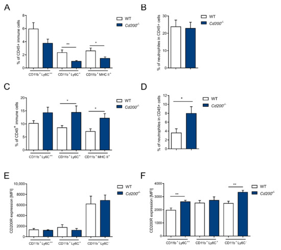 The reverse trend in cell composition was observed in the colons, where the percentage of myeloid cells was increased in Cd200−/− mice. The percentage of non-classical monocytes (CD11b+Ly6C+) was higher in Cd200−/− mice than in WT mice (14.4 ± 2.4% vs. 8.5 ± 0.7%) (p < 0.05, t-test). Similarly, the percentage of macrophages (CD11b+MHC II+) was higher in Cd200−/− mice (12.2 ± 1.7%) than in WT mice (7.1 ± 0.9%) (p < 0.05, t-test) (Figure 3C). In contrast to blood, in colon the percentage of neutrophils was higher in Cd200−/− mice (7.9 ± 1.5% vs. 3.5 ± 0.9% in WT mice) (p < 0.05, t-test) (Figure 3D). Blood monocyte subsets had a similar phenotype in both WT and Cd200−/− mice (data not shown). Inflammatory blood monocytes (CD11b+Ly6C++ and Ly6C+) expressed lower levels of CD200R in comparison to patrolling monocytes (CD11b+Ly6C−) (Figure 3E). Whereas, in the colon the expression levels of CD200R in Ly6C+ and Ly6C− myeloid cell populations were comparable and even further increased in Cd200−/− mice (Figure 3F).
