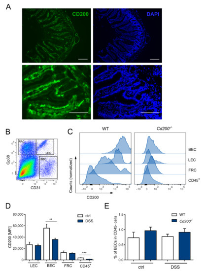 CD200 expression within the intestine. (A) Immunofluorescence staining for CD200 (green) in colon tissue from untreated mice. Cell nuclei were visualized by DAPI (blue). Intense CD200 immunostaining was observed in the subepithelial layer of the colonic villi (magnification 40× or 20×), scale bar = 100 µm; (B) Example of scatter plot used to identify BEC, LEC, and FRC subsets among CD45− fraction according to Gp38 and CD31 expression; (C) Expression of CD200 molecule in BEC, LEC, FRC, and CD45+ immune cells in intestines under DSS-induced inflammation; (D) CD200 expression in LEC, BEC, FRC, and CD45+ cells in colons of WT mice treated with DSS or controls, n = 3–8; (E) Frequency of BEC amongst CD45− fraction in the healthy or inflamed colon of WT and Cd200−/− mice, n = 3–8. Results are expressed as mean ± SEM. Significant differences were calculated using Student’s t-test ** p < 0.01. *** p < 0.001. BEC: blood endothelial cells, LEC: lymphatic endothelial cells, FRC: fibroblastic reticular cells.