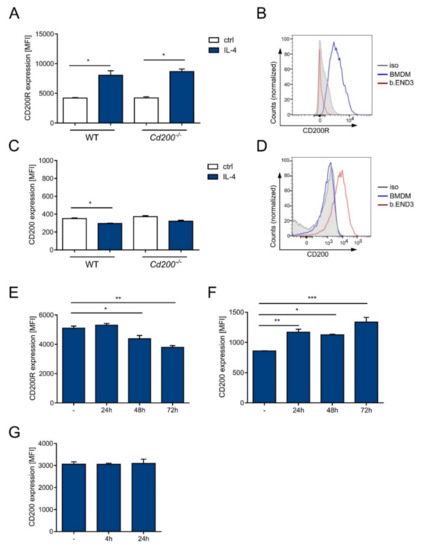 BMDMs from WT and Cd200−/− mice had high CD200R expression (Figure 5A,B). The level of CD200R was upregulated upon IL-4 treatment to a similar extent in WT and Cd200−/− mice (in WT MFI 4216 ± 81 vs. 8051 ± 761; in Cd200−/− 4234 ± 212 vs. 8676 ± 428, p < 0.05, t-test) (Figure 5A). Conversely, CD200 expression was almost absent in unstimulated or IL-4 stimulated BMDMs (Figure 5C,D). To provide a positive control for CD200+ cells, we used b.END3 cells, that lack CD200R but have substantial CD200 expression (Figure 5B,D). LPS treatment of BMDMs mildly downregulated CD200R expression (basic MFI 5100 ± 141 vs. 3792 ± 113 after 72 h-stimulation, p < 0.01, one-way ANOVA) (Figure 5E). On the contrary, it induced slight upregulation of CD200 expression in BMDMs (basic MFI 859 ± 2 vs. 1337 ± 77 after 72 h-stimulation, p < 0.001, one-way ANOVA) (Figure 5F). CD200 expression in b.END3 cells (basic MFI 3059 ± 109) was higher than in BMDMs (Figure 5F,G). and it was unaffected by LPS treatment (Figure 5G).
