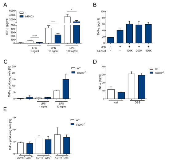 Production of TNF-α by BMDMs and colon tissue in the presence or absence of CD200 expression. (A) The concentration of TNF-α was measured in the supernatants from the co-culture of WT BMDMs and b.END3 cells after 24 h of incubation with or without 1–100 ng/mL LPS, n = 4–6; (B) The concentration of TNF-α was measured in the supernatants from 24-h co-cultures of WT BMDMs and indicated a number of b.END3 cells with or without 1 ng/mL of LPS without direct contact of two populations (Transwell system), n = 2–3; (C) Percentage of TNF-α+ WT or Cd200−/− BMDMs after 4 h incubation with 1 or 10 ng/mL LPS, n = 3. (D) The concentration of TNF-α in medium from 24 h culture of colon explants isolated from control or DSS-treated WT and Cd200−/− mice, n = 8–13; (E) Percentage of TNF-α+ myeloid cells: CD11b+Ly6C++, CD11b+Ly6C+ and CD11b+Ly6C− in colons of DSS-treated WT and Cd200−/− mice, n = 6–9. Results are expressed as mean ± SEM. Significant differences were calculated using Student’s t-test * p < 0.05. *** p < 0.001. **** p < 0.0001.