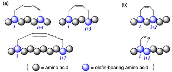 Introducing hydrocarbon stapling on the side chains of peptides is a promising technique for stabilizing the secondary structure of peptides and enhancing their functionalities [1,2,3,4,5]. Hydrocarbon stapling can be easily obtained by ring-closing metathesis reactions between olefin-bearing amino acid residues using Ru catalysts [6,7]. After the report on α-helicity-inducing all-hydrocarbon stapled peptides at i,i + 4 and i,i + 7 positions by Verdine et al. [8], several studies focused on the approach (as illustrated in Figure 1a) [9,10,11]. Currently, all-hydrocarbon stapled peptides are very important in drug development targeting protein–protein interactions because the pharmacophores interact via α-helical motifs [12]. Hydrocarbon stapling at i,i + 3 positions are reported in the literature [13,14,15]. For example, O’Leary et al. reported E-selective ring-closing metathesis between O-allyl-tethered l-serines at i,i + 3 positions to produce 310-helical peptides [13]. Other hydrocarbon staples, such as i,i + 1 and i,i + 2, were not well researched, and their 3D structures are unknown (as illustrated in Figure 1b) [16,17,18,19]. In general, hydrocarbon stapling sacrifices two amino acid residues for the crosslinking motif, and those residues should not include essential residues for their biological activities. Based on this, the development of a large variety of hydrocarbon stapling at different positions can be achieved. Herein, we report hydrocarbon stapling of peptides at i,i + 1 positions by ring-closing metathesis reactions and the X-ray crystallographic structure of the right-handed α-helical octapeptide stabilized by i,i + 1 stapling.