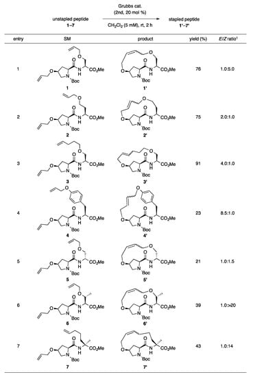 Our previous report suggests the usefulness of cis-4-hydroxy-l-proline as an olefin-bearing amino acid for peptide stapling [19]. Thus, in this study, we started by optimizing the reaction conditions for i,i + 1 peptide stapling using cis-4-hydroxy-l-proline. We screened the ring-closing metathesis reaction at i,i + 1 positions using dipeptide 1 as the cyclization precursor (as illustrated in Table 1). The reaction catalyzed by 20 mol% of second-generation Grubbs catalyst in CH2Cl2 (20 mM) produced the desired 1′ in 55% yield as a mixture of E/Z-isomers (E/Z = 1.0:5.6; Entry 1). A comparable result was obtained using the first-generation Grubbs catalyst (Entry 2). Replacing the reaction solvents, such as toluene, 1,2-dichloroethane (DCE) and tetrahydrofuran (THF), decreased the yields and Z-selectivities (Entries 3–5). The reaction under diluted condition (5 mM in CH2Cl2) afforded the best yield at 76% (Entry 6). The reactions in refluxing CH2Cl2 resulted in insufficient yields due to the degradation of the desired product (Entries 8 and 9).