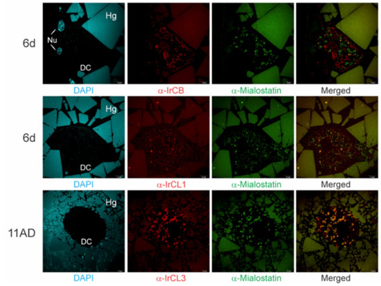 Mialostatin co-localizes with IrCL3 inside gut digestive cells of female I. ricinus ticks. Multicolored confocal immunofluorescence indicates variable colocalization of mialostatin (green signal) with the cathepsin-type proteases IrCB, IrCL1, and IrCL3 (red signal) in female tick gut sections at the sixth day of feeding (6d) and eleventh day post detachment from the host (11AD). Mialostatin and IrCL3 show the greatest co-localization (yellow signal in merged images), thus IrCL3 represents the most probable target protease. DAPI counterstaining is shown in cyan. DC—digestive cells; Nu—nucleus; Hg—hemoglobin crystals in gut lumen, scale bar-10 µm.