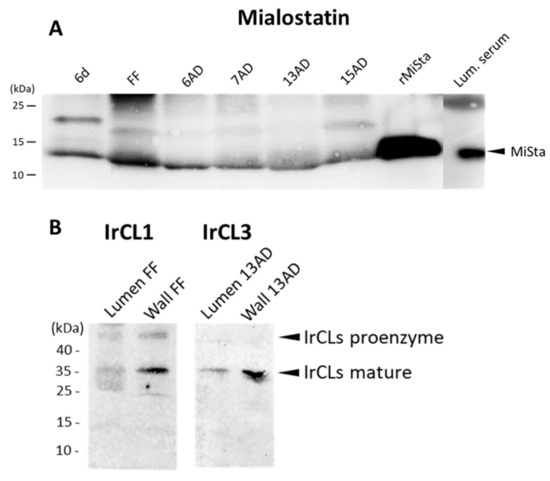Western blot analysis of mialostatin, IrCL1, and IrCL3 in the tick midgut. (A) Tick midgut wall tissue extracts from various stages of tick feeding and midgut lumina from fully fed ticks were analyzed by SDS-PAGE and Western blotting. Mialostatin was labeled with a mouse monoclonal antibody and its signal detected using a fluorescently labeled secondary antibody. (B) Tick midgut wall and midgut lumen homogenates from fully fed ticks were analyzed by SDS-PAGE and immunoblotting with α-IrCL1 and α-IrCL3 rabbit polyclonal antibodies. Goat α-rabbit IgG Alexa 488 fluorescent secondary antibody was used to visualize protein bands using ChemiDoc MP imager. 6d—sixth day of feeding; FF—fully fed; 6, 7, 13, 15 AD—days post detachment from the host. Lum. serum—luminal fluid from ticks fed on erythrocyte-free serum; rMista—recombinant mialostatin. Full view of presented Western blots can be found in the Supplementary Materials, Figures S2–S4.