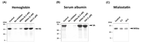 In tick gut tissue, cysteine cathepsins play a critical role in the acidic degradation of the two most abundant host blood proteins, hemoglobin and serum albumin. In particular, cathepsin L is involved in the initial phase of the degradation pathway, which is continued by the action of cathepsins B and C [5,6]. We evaluated the effect of mialostatin on the in vitro degradation of hemoglobin and serum albumin by the proteolytically active extract of I. ricinus gut tissue (limited to cysteine proteases by treatment with inhibitors of other protease classes). Both blood proteins were digested at optimal acidic pH, and SDS-PAGE analysis demonstrated highly efficient degradation of these substrates (Figure 4A,B). These processes were effectively blocked by mialostatin in a dose-dependent manner, with complete inhibition at a low nanomolar concentration of mialostatin. A similar effect was achieved by adding E-64, a small molecule general inhibitor of cysteine cathepsins. Further, we tested the stability of mialostatin exposed to the complex proteolytic environment of the gut tissue extract (Figure 4C), which revealed that mialostatin was generally stable and showed only partial degradation over long-term treatment. In summary, the blood protein digestion catalyzed by cysteine cathepsins of I. ricinus can be effectively controlled by mialostatin under native-like conditions.